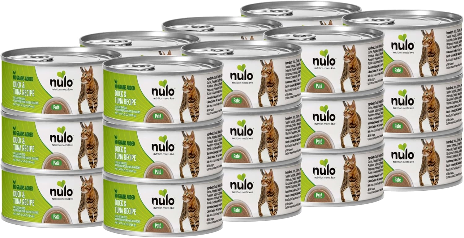 - DUCK & TUNA RECIPE cans - Nulo Freestyle Cat & Kitten Wet Pate Canned Cat Food features our proprietary blend of grain-free proteins and vitamins ideal for cats with diagnosed grain allergies and sensitivities. Pack of 24, 5.5 Oz each.