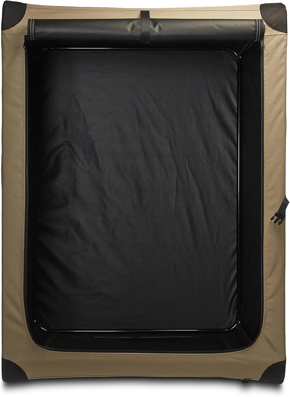 - Includes an XL dog crate made of tan polyester fabric and a lightweight yet sturdy steel frame