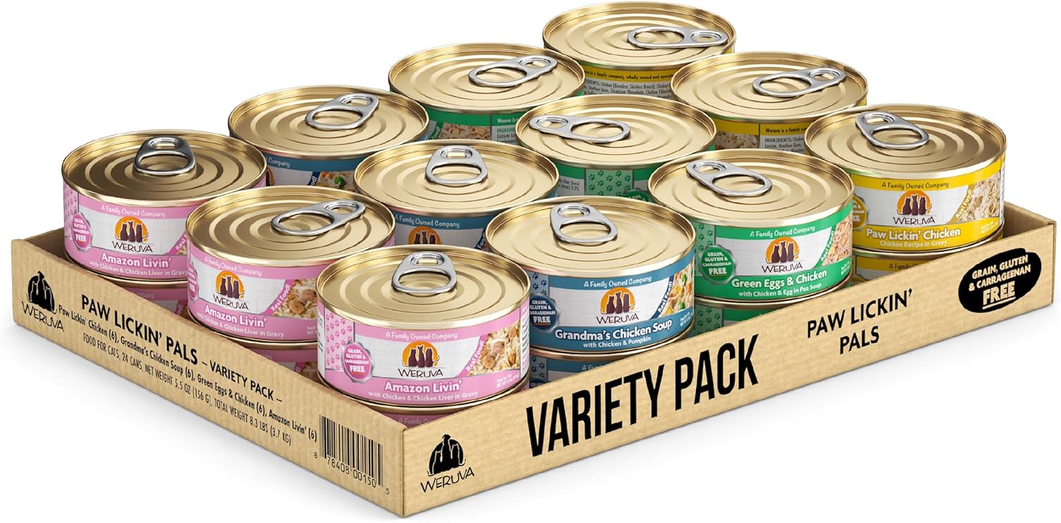 - Variey Pack includes 6 cans of each: Paw Lickin’ Chicken, Green Eggs & Chicken, Grandma’s Chicken Soup and Nine Liver.