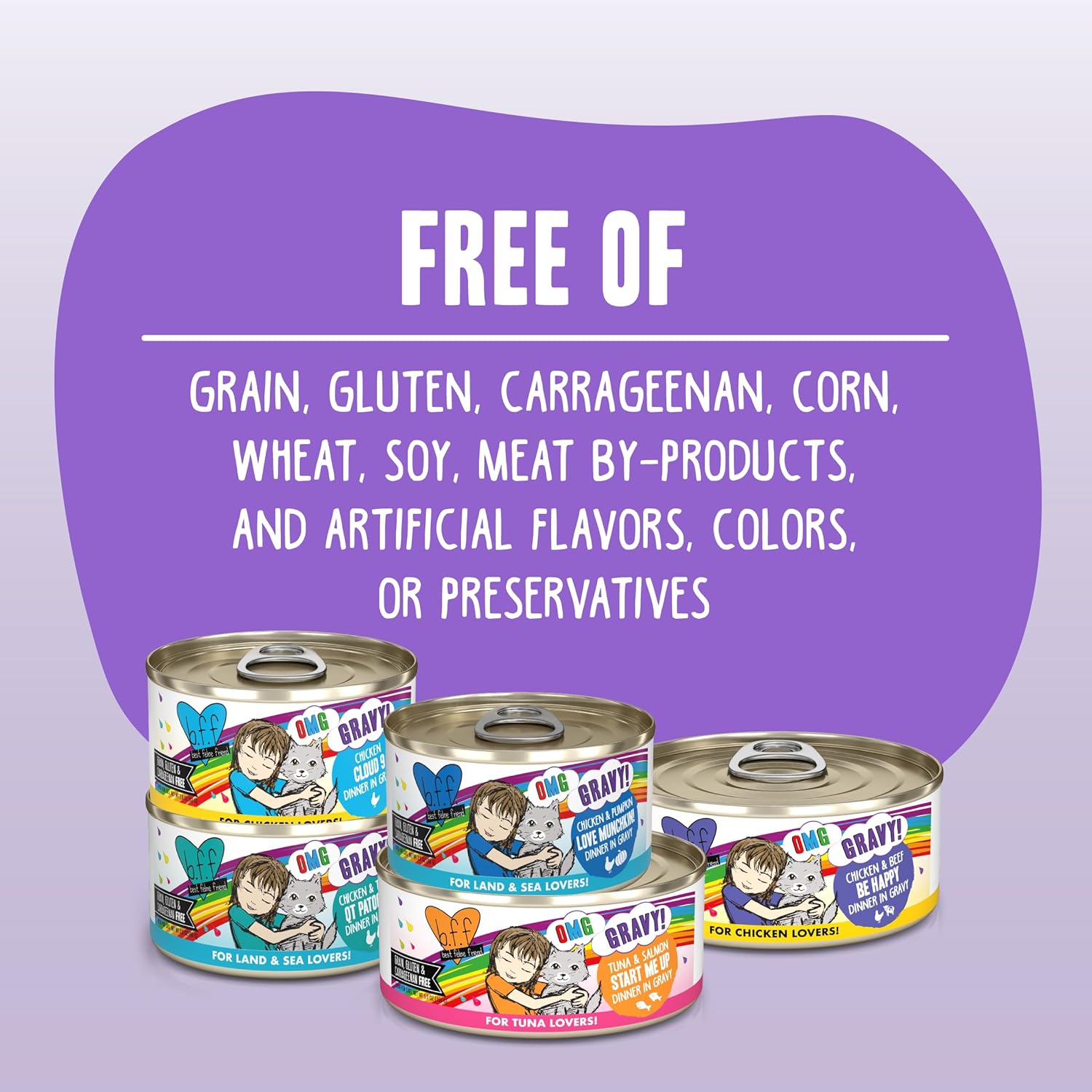 - B.F.F. OMG - Your Best Feline Friend will love these extra juicy flavors. Oh my Gravy!