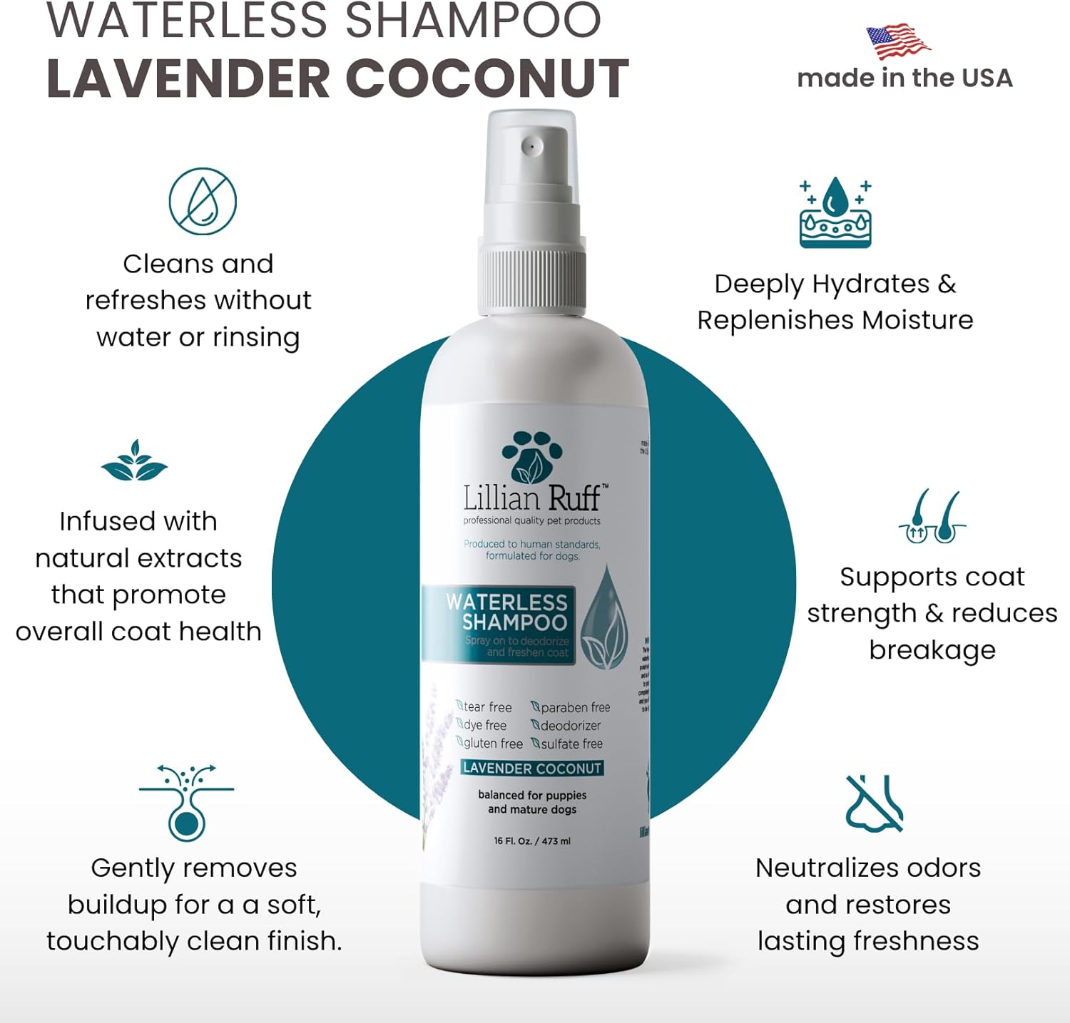Lillian Ruff Waterless No-Rinse Dog Dry Shampoo Spray with Hydrating Essential Oils - pH-Balanced Dry Shampoo for Dogs - Clean, Condition, Detangle & Deodorize Dry, Sensitive Skin (16oz/Brush)
