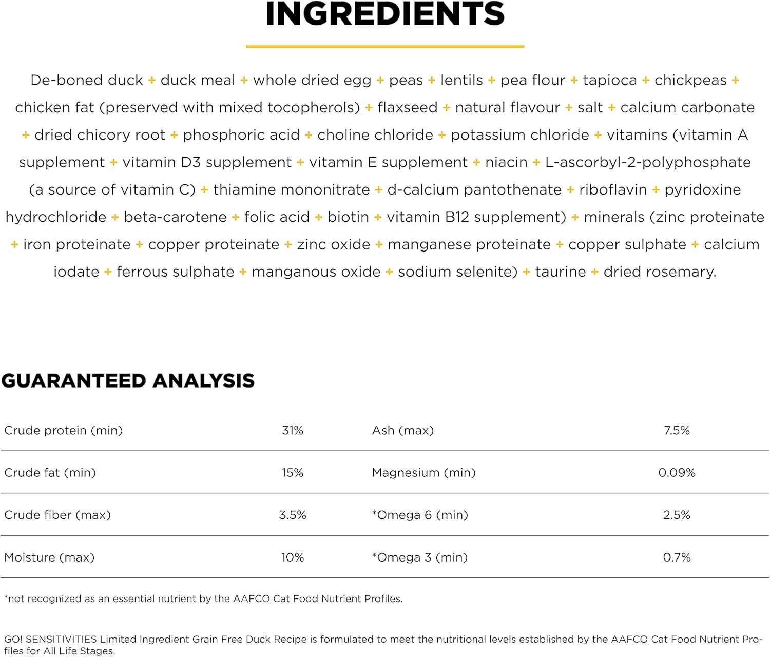 - WITH NATURAL INGREDIENTS + REAL DUCK: Grain free cat food with cage-free de-boned duck as the first ingredient, prebiotic fiber from dried chicory root to support sensitive stomachs and zero by-product meals or artificial preservatives.