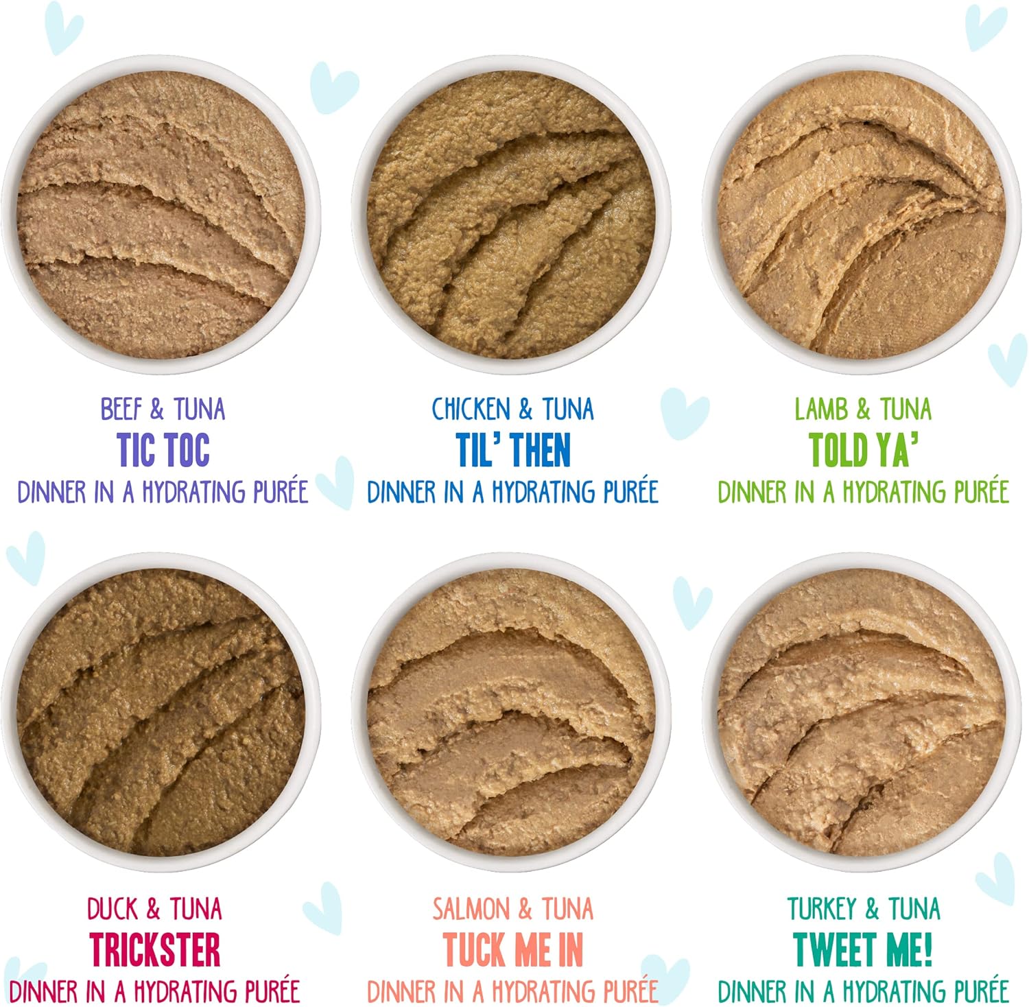 - Variety Pack includes: Chicken & Tuna Til' Then, Salmon & Tuna Tuck Me In, Beef & Tuna Tic Toc, Duck & Tuna Trickster, Turkey & Tuna Tweet Me, & Lamb & Tuna Told Ya