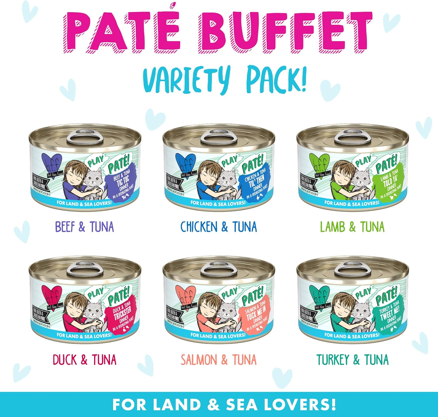 - B.F.F. Blue Patés Buffet! (2.8oz cans, pack of 18) A selection of six (6) all-natural surf and turf recipes that feature cage-free poultry and sustainably-sourced fish for your Best Feline Friend!