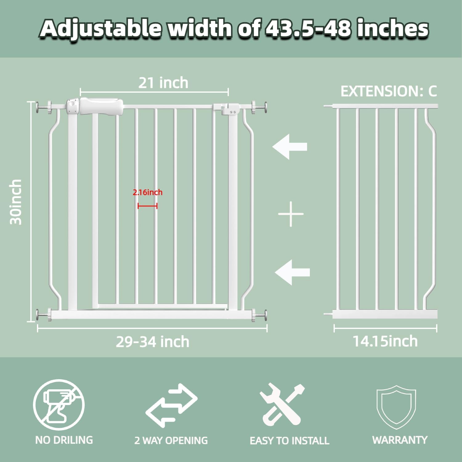 - 【GREAT FOR MOST OPENINGS】Our white gate is suitable for different doors! Choose for openings between 25"-76.37".We have different baby gates sizes,it doesn't include all extensions,the extension which you received denpends on your door opening.Whether your dooway is wide or narrow ,you can find the suitable baby gate or pet gate.And our large walk thru gate makes it easier to walk when holding the baby.