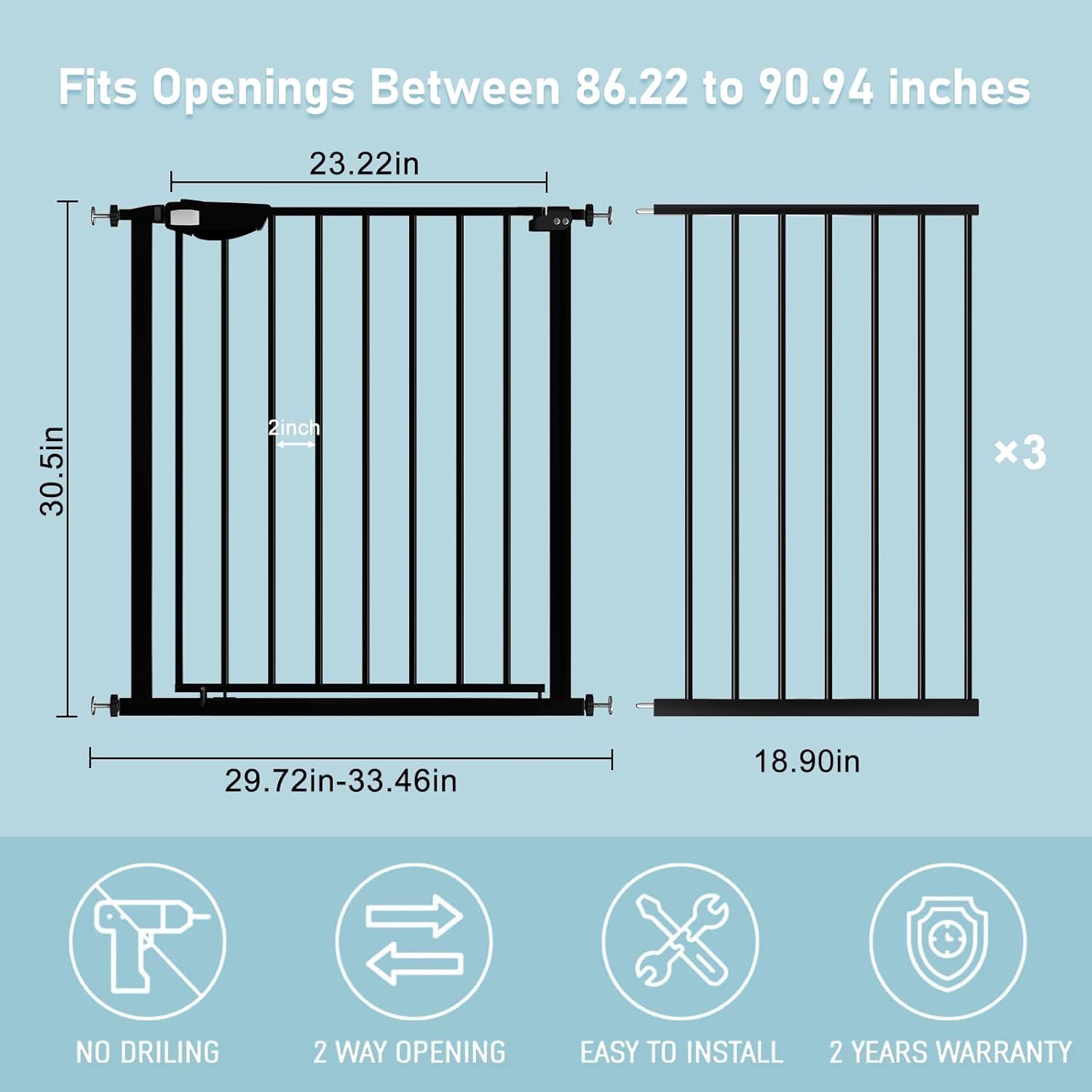 WAOWAO Triple Lock Baby Gate Extra Wide 86.22-90.55" Pressure Mounted Walk Through Swing Auto Close Safety Black Metal Dog Pet Puppy Cat for Stairs,Doorways,Kitchen