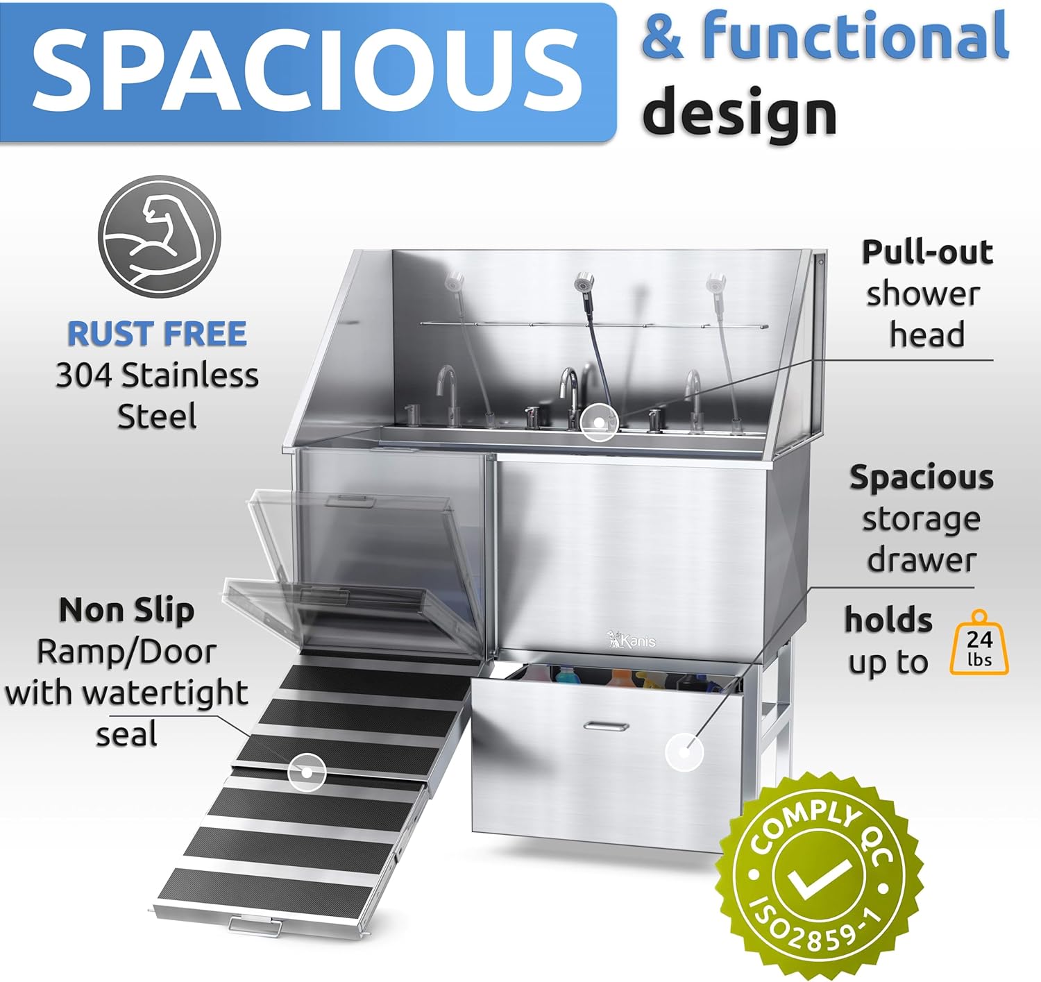 KANIS Professional Dog Washing Station - 304 Stainless Steel Pet Wash Sink & Grooming Bath Tub for Home with Ramp, Shower, Floor Grate, Storage Drawer, Faucet, Drain Kit for Large, Medium & Small Pets