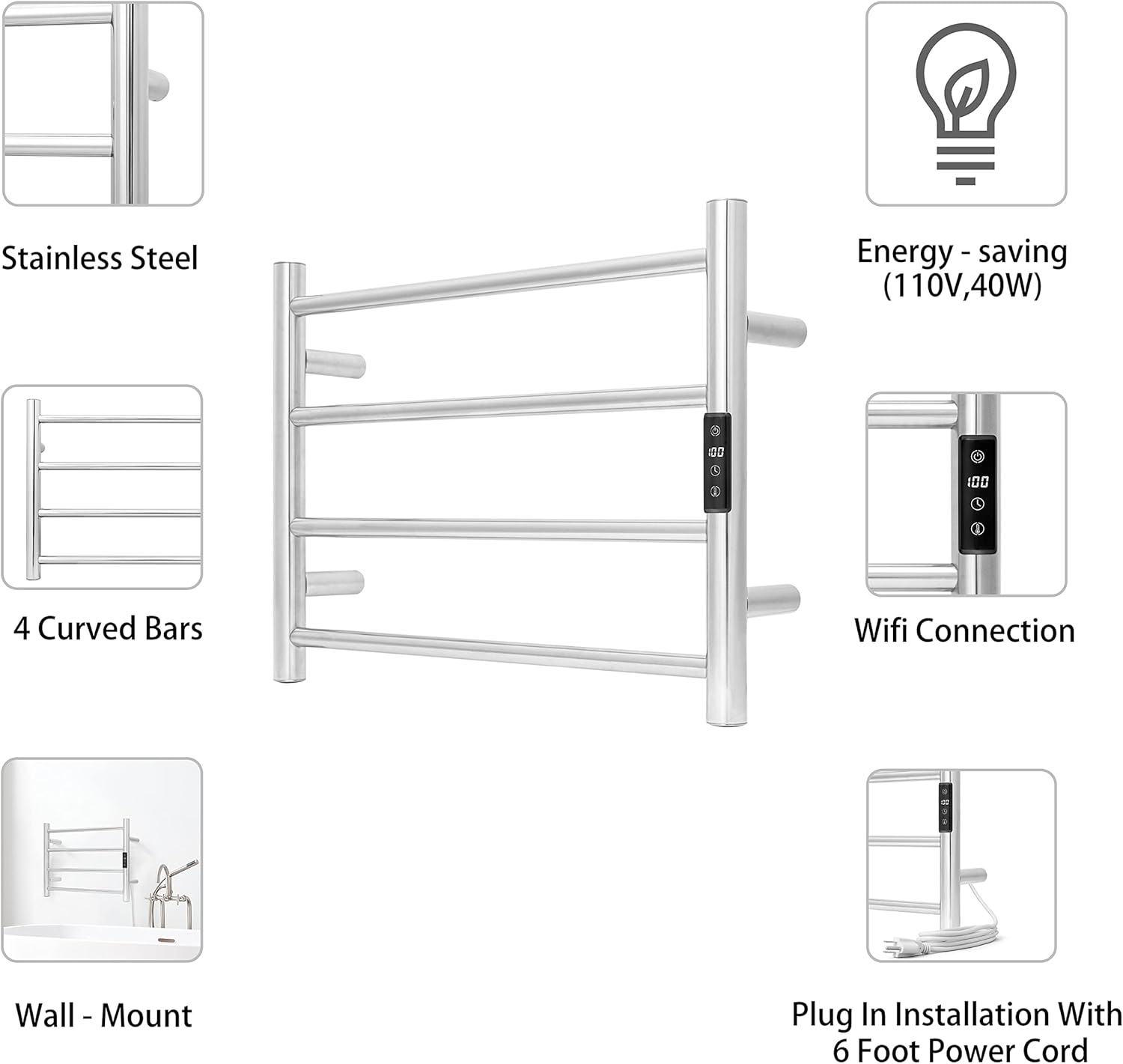 KEG Smart WiFi Towel Warmer Wall Mounted with Built-in Timer and Temperature Adjust Control, 4 Bars Electric Stainless Steel Heated Towel Racks for Bathroom Brushed Nickel