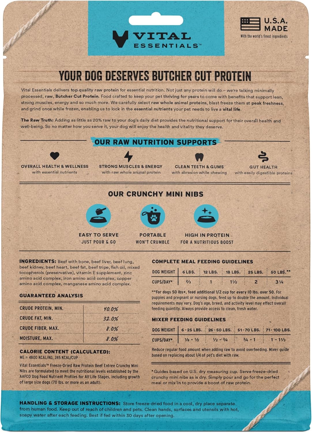 - CRUNCHY FREEZE-DRIED RAW BEEF DOG FOOD: Vital Essentials Crunchy Freeze Dried Dog Food packs more protein than industry standard into every bite to deliver the peak vitality your dog deserves, especially when compared to dehydrated dog food. This complete and balanced freeze-dried raw dog food is made with premium butcher cut beef, responsibly sourced in the USA.
