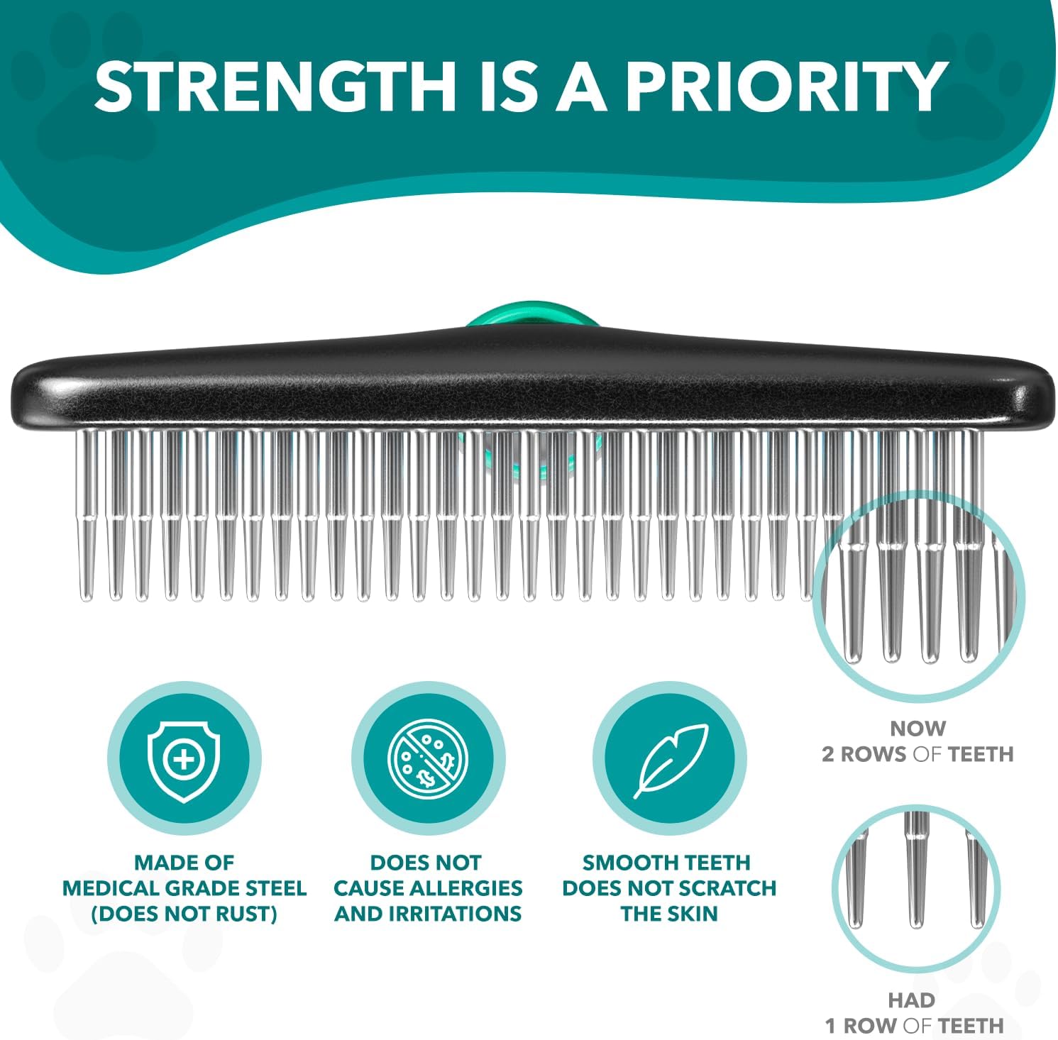 - One of the best dog brushes on the market, It has a double row of stainless steel pins/teeth to reduce pulling the coat without damaging it or hurting your pet. It is a very gentle experience for your dog, cat, rabbit, or any other furry friend that needs brushing.