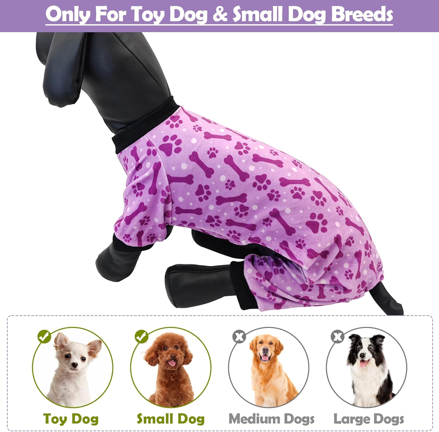- Dog Onesies Outfits with Feet: Our jumpsuit for small dogs use pullover design, there are 4 legs and elastic waist and stretch to adjust with most breeds. The belly crotch and rear are all open of the dog jammies for small dogs, no need to remove when dog goes potty. For pets with tails, it's more comfortable and easy to put on and put off.