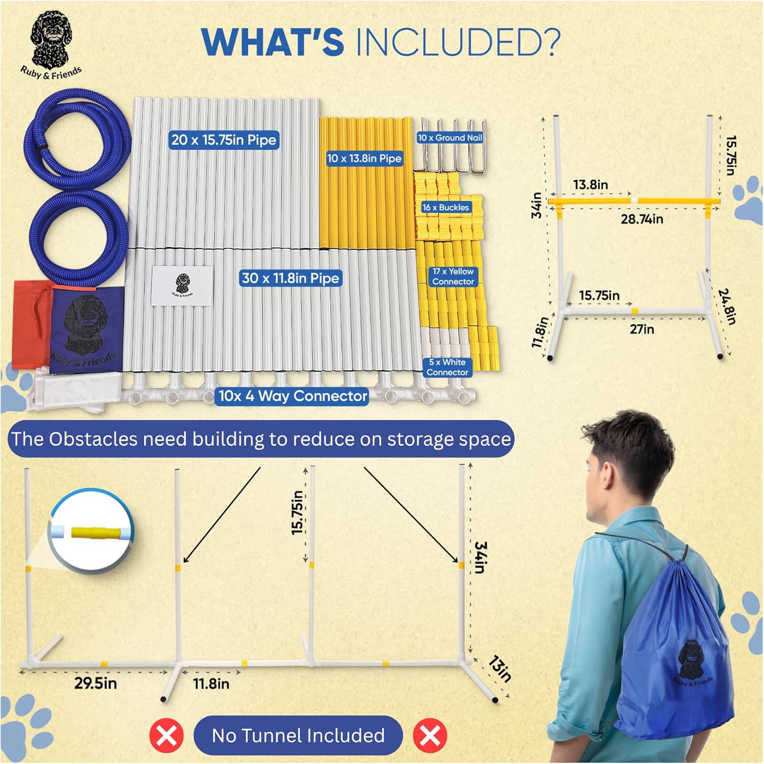 - 6 COURSE VARIATIONS: Get 6 course variations with the Ruby & Friends Dog Agility Set. Perfect for creating diverse dog agility jumps and dog agility weave poles in your backyard, offering endless fun and exercise for your dog.