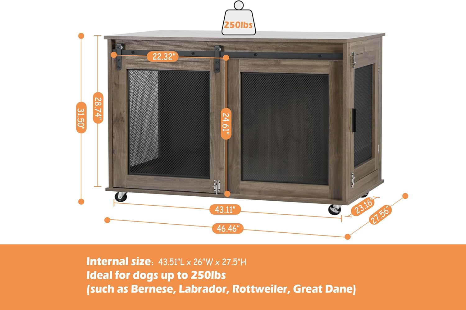 - 【Modern Dog Kennel】Modern Grey Dog crate furniture with sliding barn doors, suitable for any home decoration style. 5 wheels at the bottom, 2 can be fixed and can be moved anywhere you want