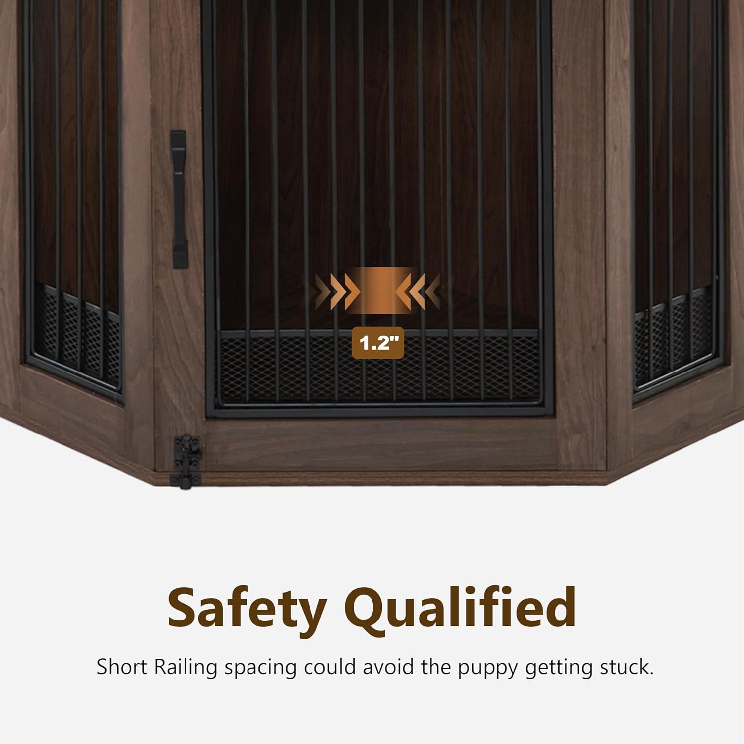 - Safety Protection: The distance between pet kennel bars is 1.2" to prevent the puppy from getting stuck. Anti-tip straps and non-slip pads could avoid the wooden dog house topple.