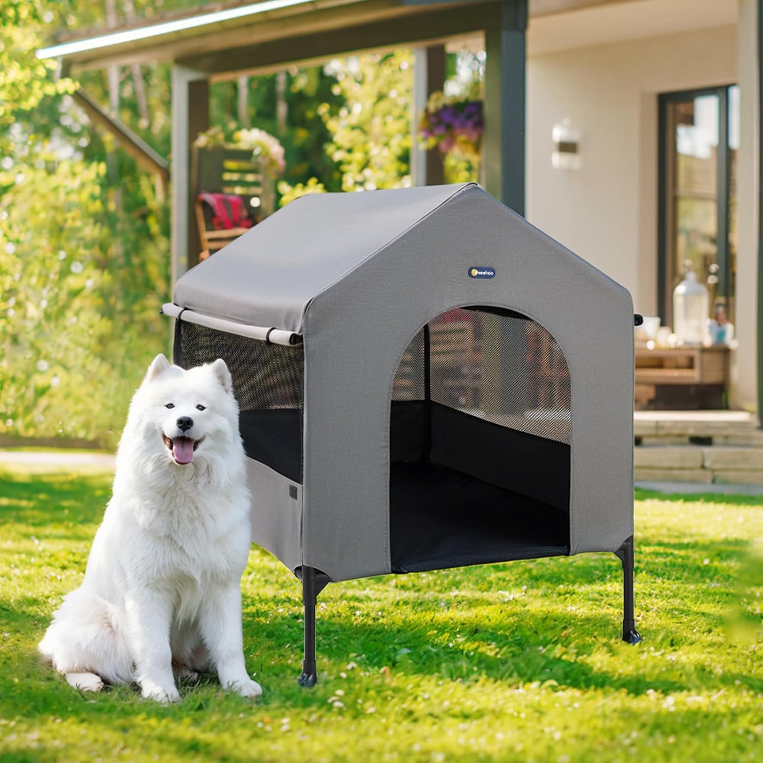 Veehoo 35" Dog House, 2-in-1 Large Dog House Outdoor Indoor Weatherproof, Outside Elevated Dog Cot Bed Dog Tent Shade, Three-Sided Breathable Mesh Windows and Sunshades, CWC2435CP