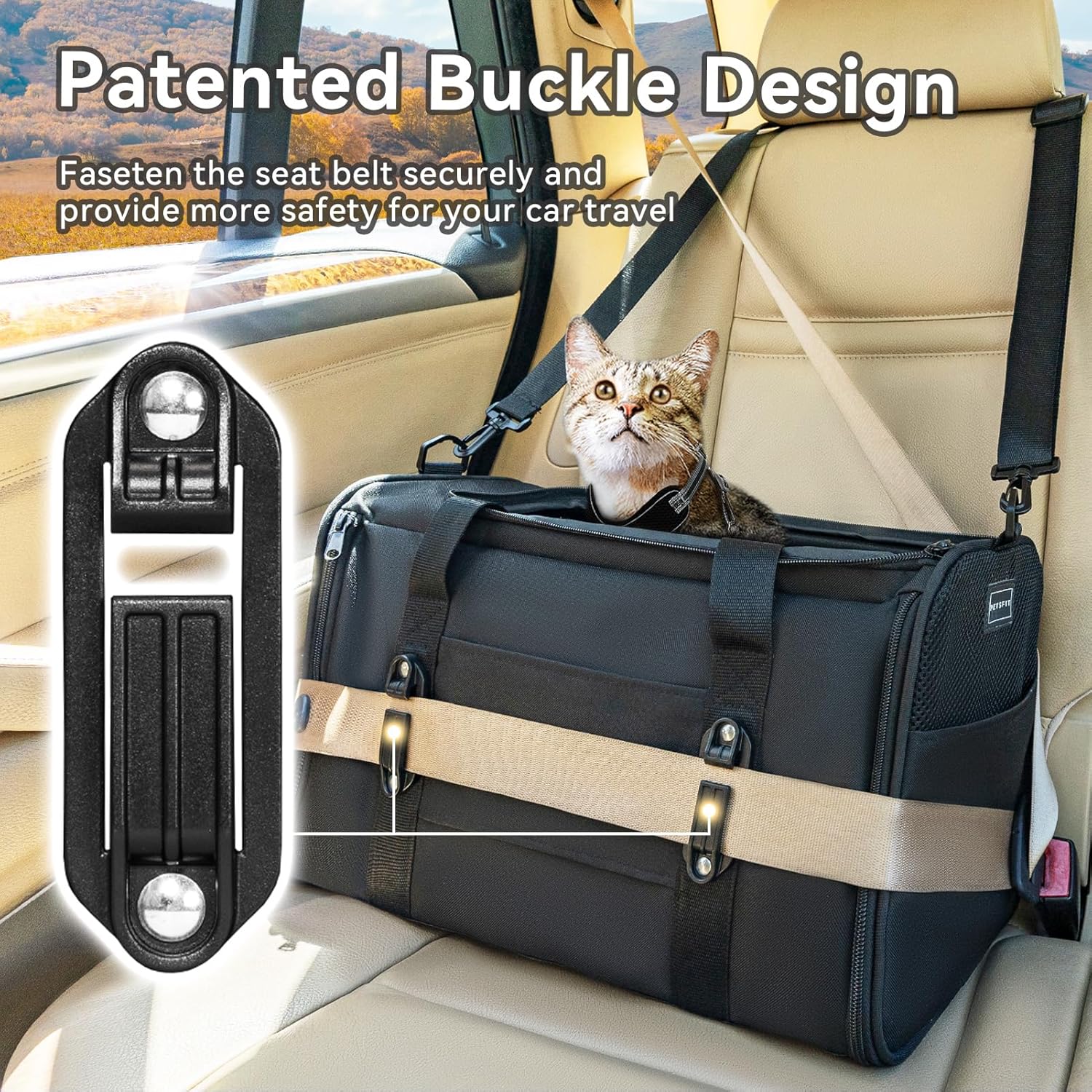 PETSFIT Soft-Sided Cat Carriers & Car Seats with Patent Safe Buckles, Clip-On Harness, 18"x11"x11" Airline Approved Pet Carrier - 9 lbs Capacity (Black)