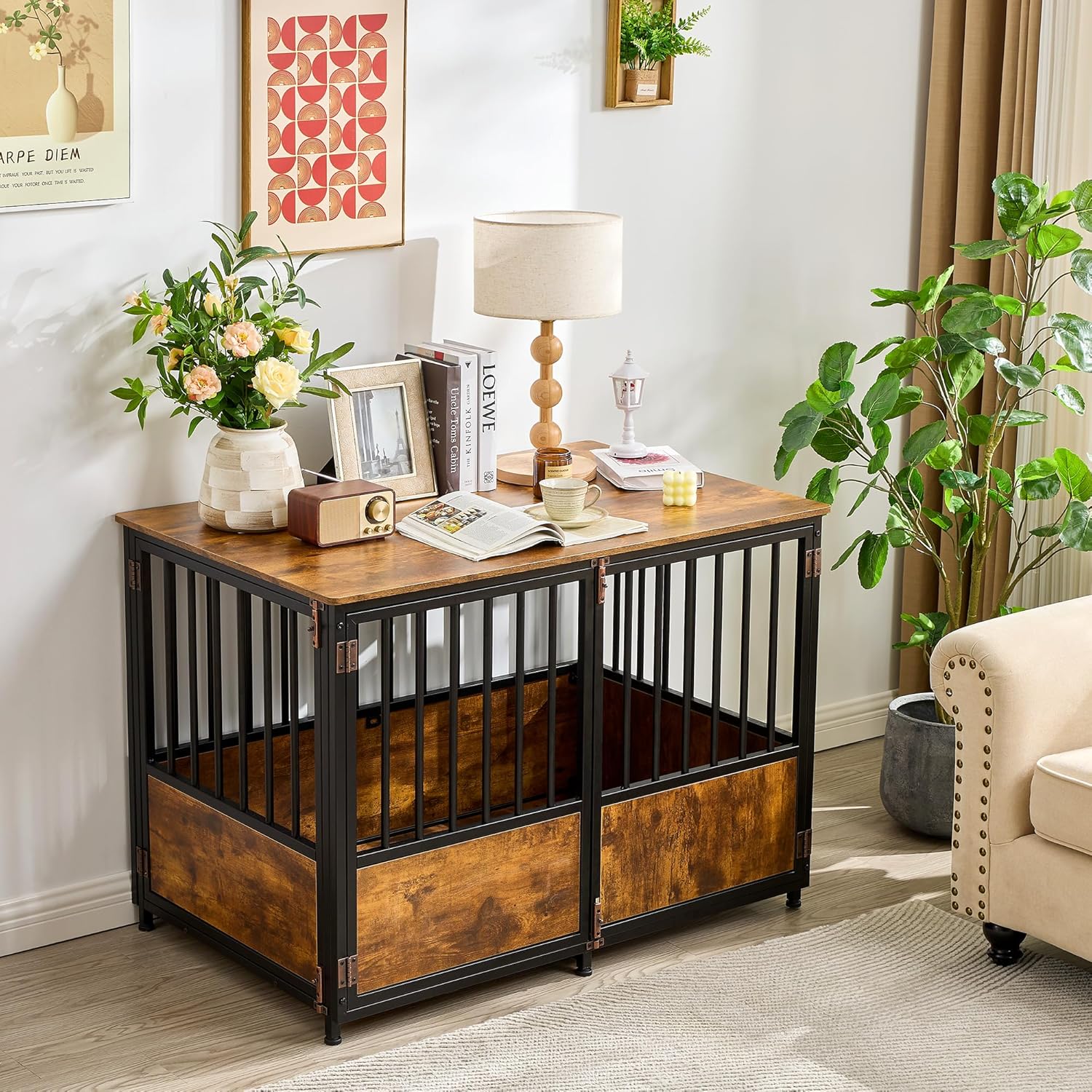 - 【Multi-Purpose Use】-- The combination of dog kennel and modern furniture makes this dog crate more than just a kennel. Dogs as our families need a private and safe space to rest. Also, it can be used as an elegant side table, end table, and nightstand in the living room and bedroom. Classic rustic vintage styles can easily match a variety of home styles