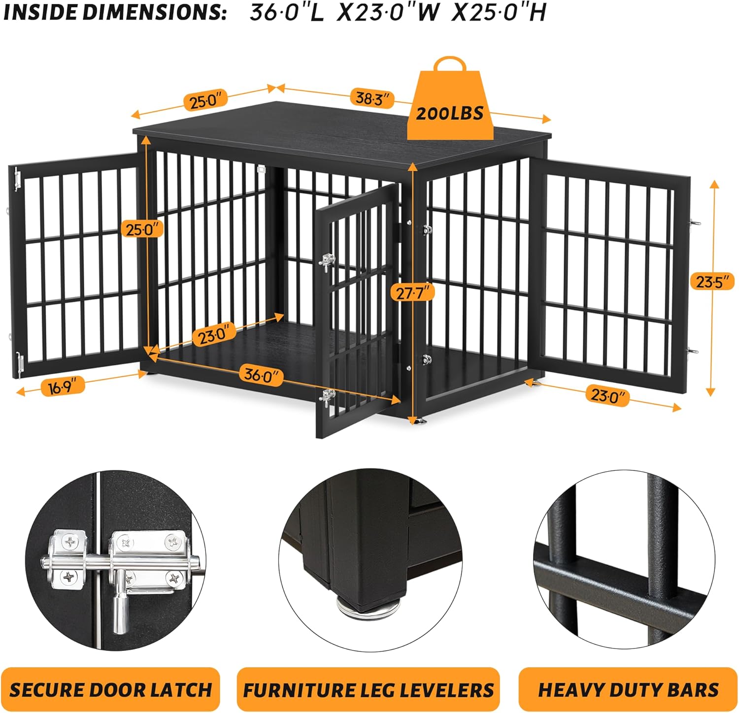 - 【Assemble with Ease】Inside Dimensions: 36"L x 23.0"W x 25"H, Overall Dimensions: 38.3"L x 25.0"W x 27.7"H. Choosing the right crate size is vital to ensure your dog’s safety and comfort.