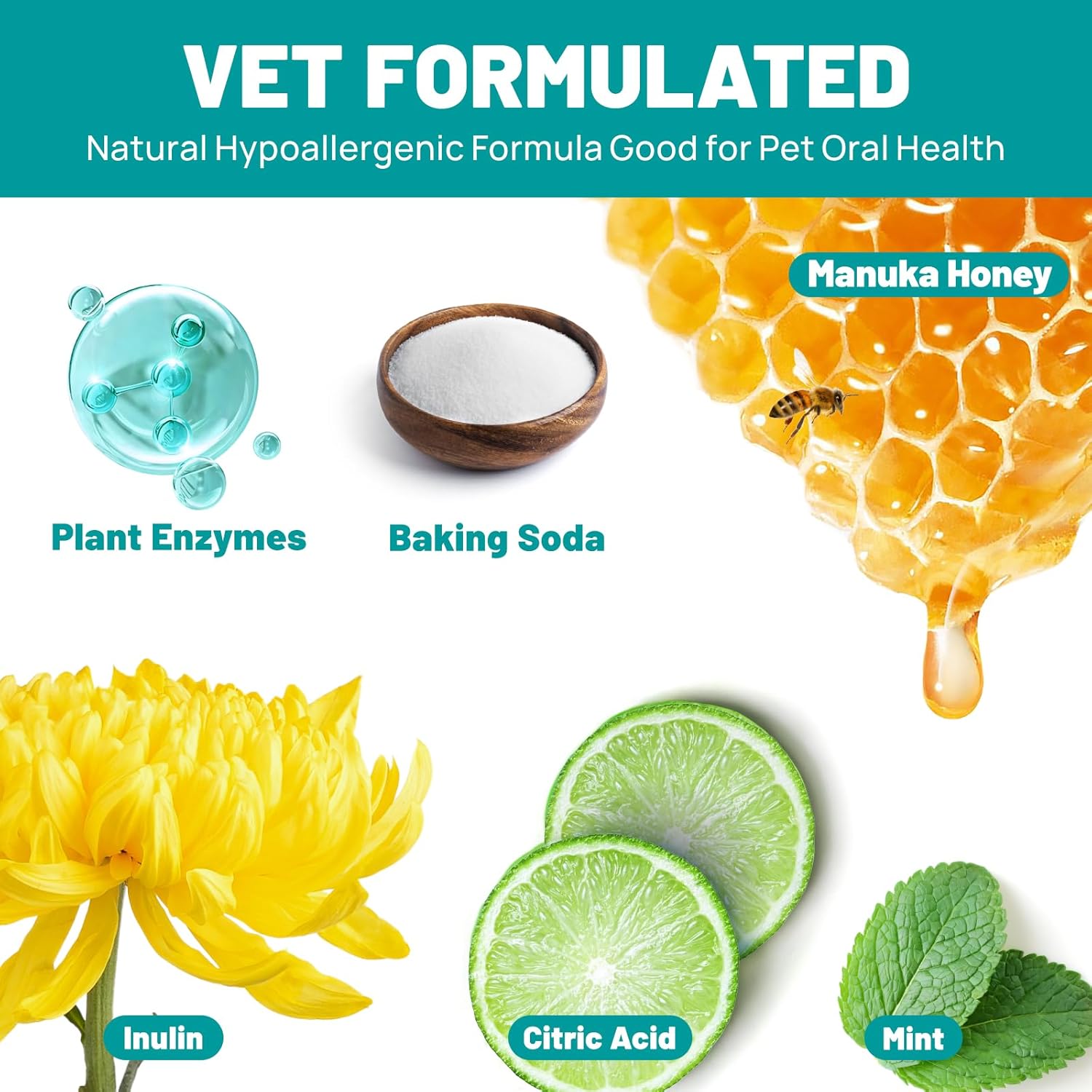 - Vet-Approved Formula: Our pet dental wipes combine natural ingredients to actively support your pet's oral health. Plant Enzymes target and break down plaque biofilm at the source, preventing tartar buildup. Baking Soda neutralizes acids for fresher breath. Manuka Honey calm sensitive gums. Tea Polyphenols inhibit harmful oral substances. It's safe if licked or ingested. Perfect for pets with sensitive gums, weak enamel, or those who resist conventional dental care.