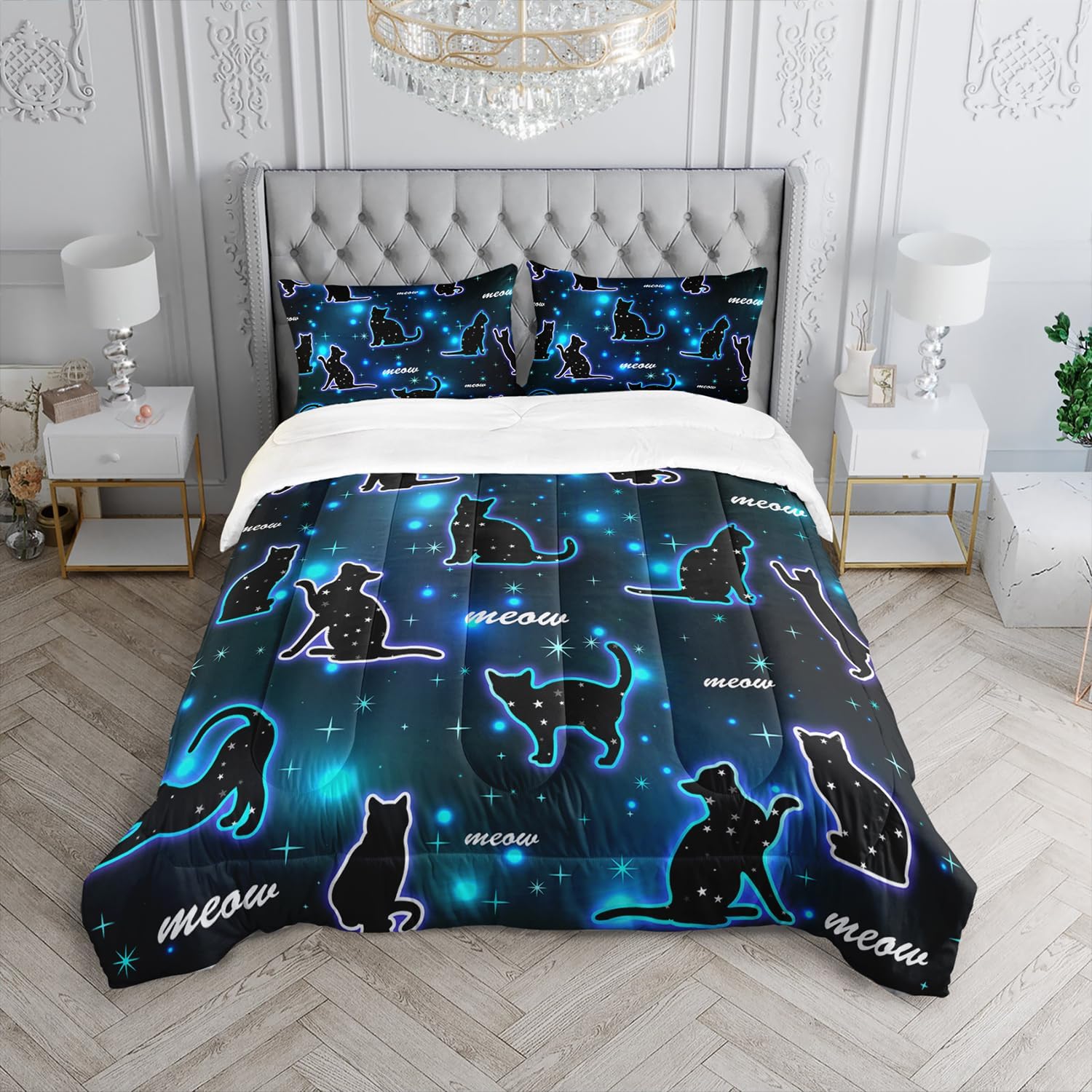 - Cute cat design: This cat comforter is themed around cartoon cats with various shapes. Against a black background, each cat is lively and adorable in the sparkling light. Very suitable for children and women who love pets, it can make your room lively and interesting. Make children's bedding look lively and cute.