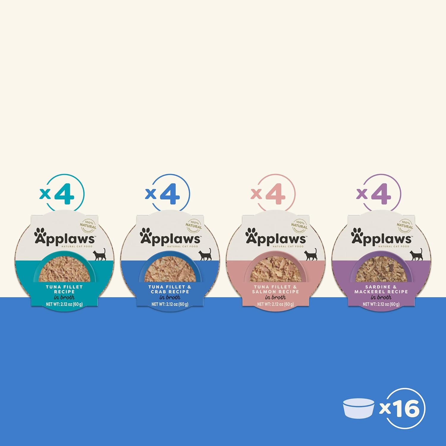Applaws Natural Wet Cat Food, Limited Ingredient, Grain-Free, Protein with No Artificial Additives, Variety Fish Selection in Broth (16 x 2.12 oz Easy-Open Cups)