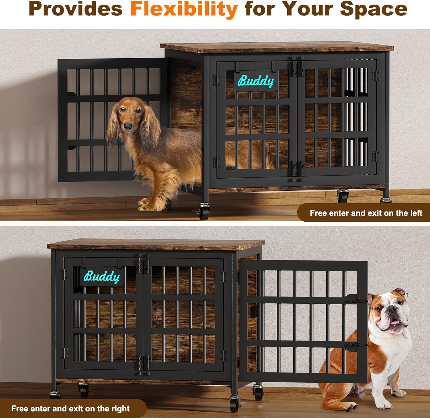 - Elegant Furniture Aesthetics: Boasting a distinct furniture-inspired design, the dog cage showcases sleek lines and a tasteful appearance. It effortlessly meshes with diverse home decor themes, transforming from a mere dog crate into an eye-catching piece that complements your interior furnishings harmoniously.