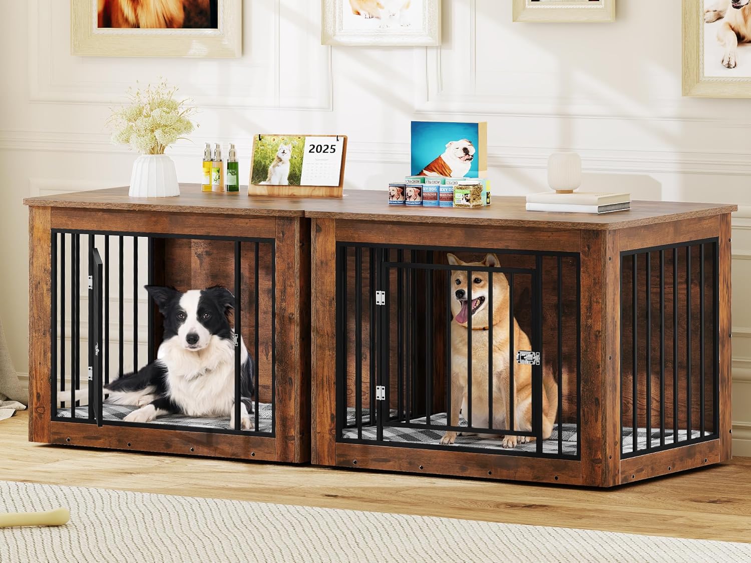 - Iron-Wood Fusion: The dog crate furniture for 2 dogs combines a 15mm square tube and 15mm chipboard for added solidity and durability; This fusion promotes both strength and aesthetic appeal; The rustic brown finish blends well with any home decor, making it a versatile addition to your living space