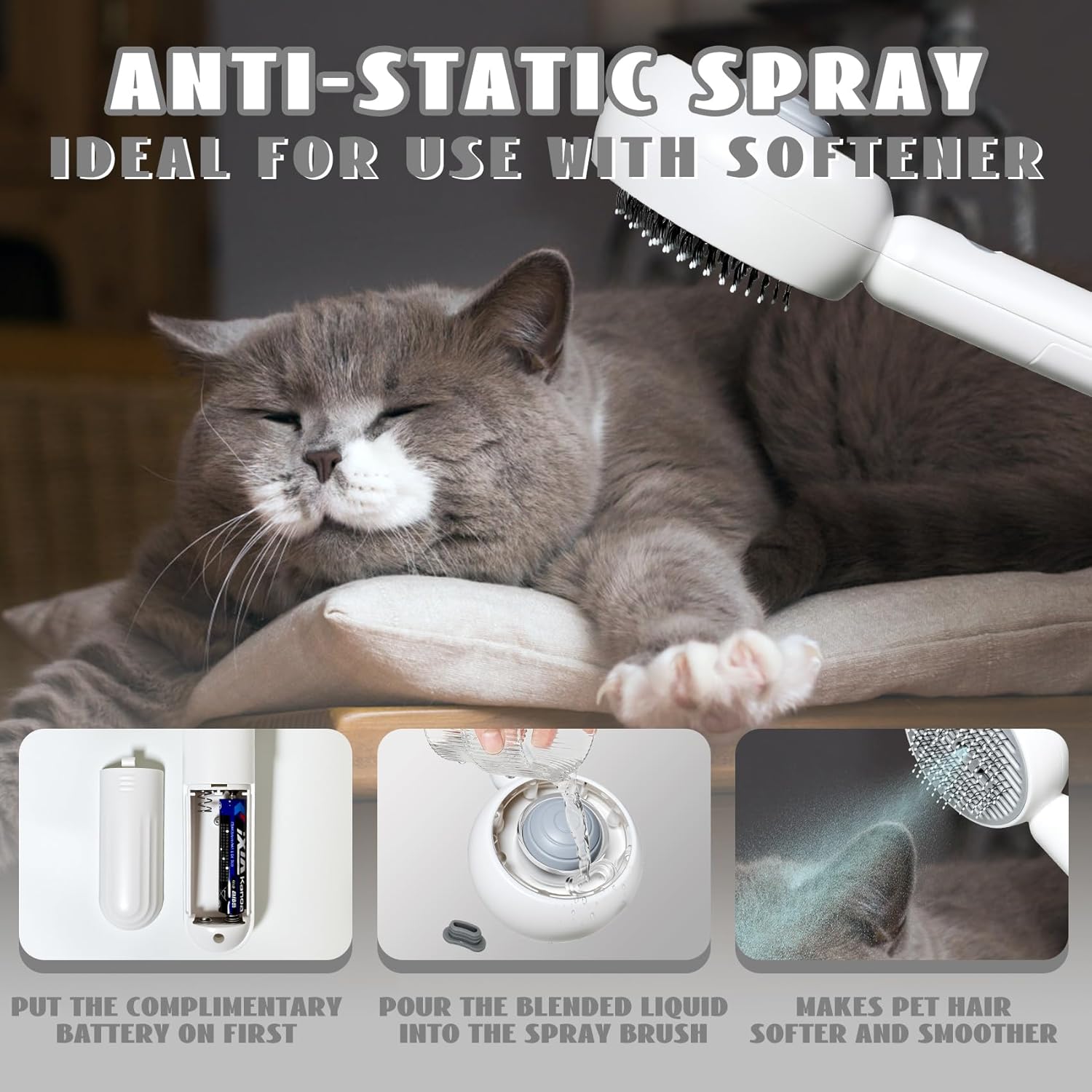 - This 2-in-1 cat hair brush is designed with a unique spray function that effectively avoids the generation of static electricity and flying hair. No more annoying hair sticking to your clothes or furniture!