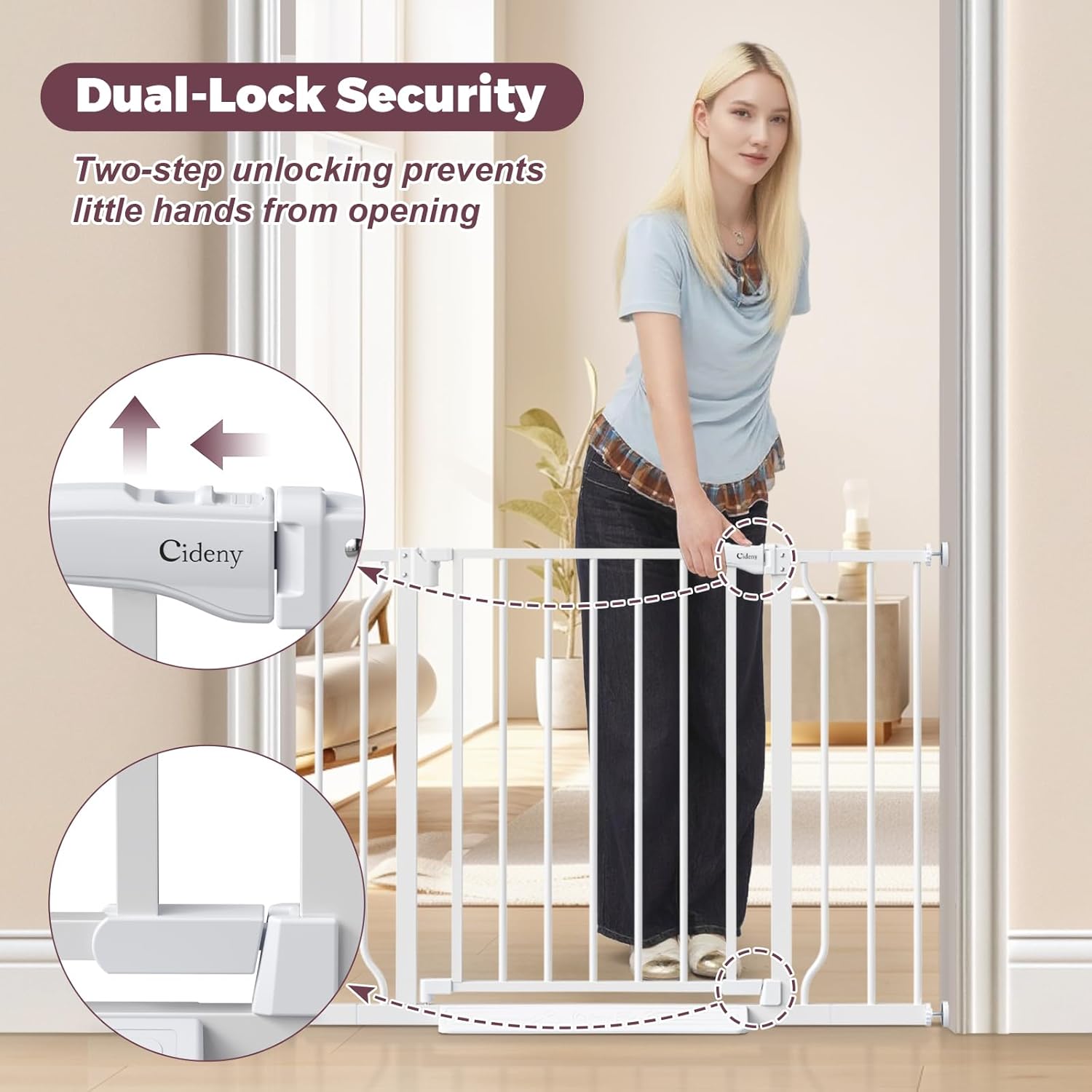 - Dual-Lock Safety: This pet gate for doorways no drilling features a secure dual-lock mechanism, ensuring curious children and pets stay safely contained while allowing adults to open it effortlessly with one hand. Parents can pass through with ease even while carrying groceries or a baby.