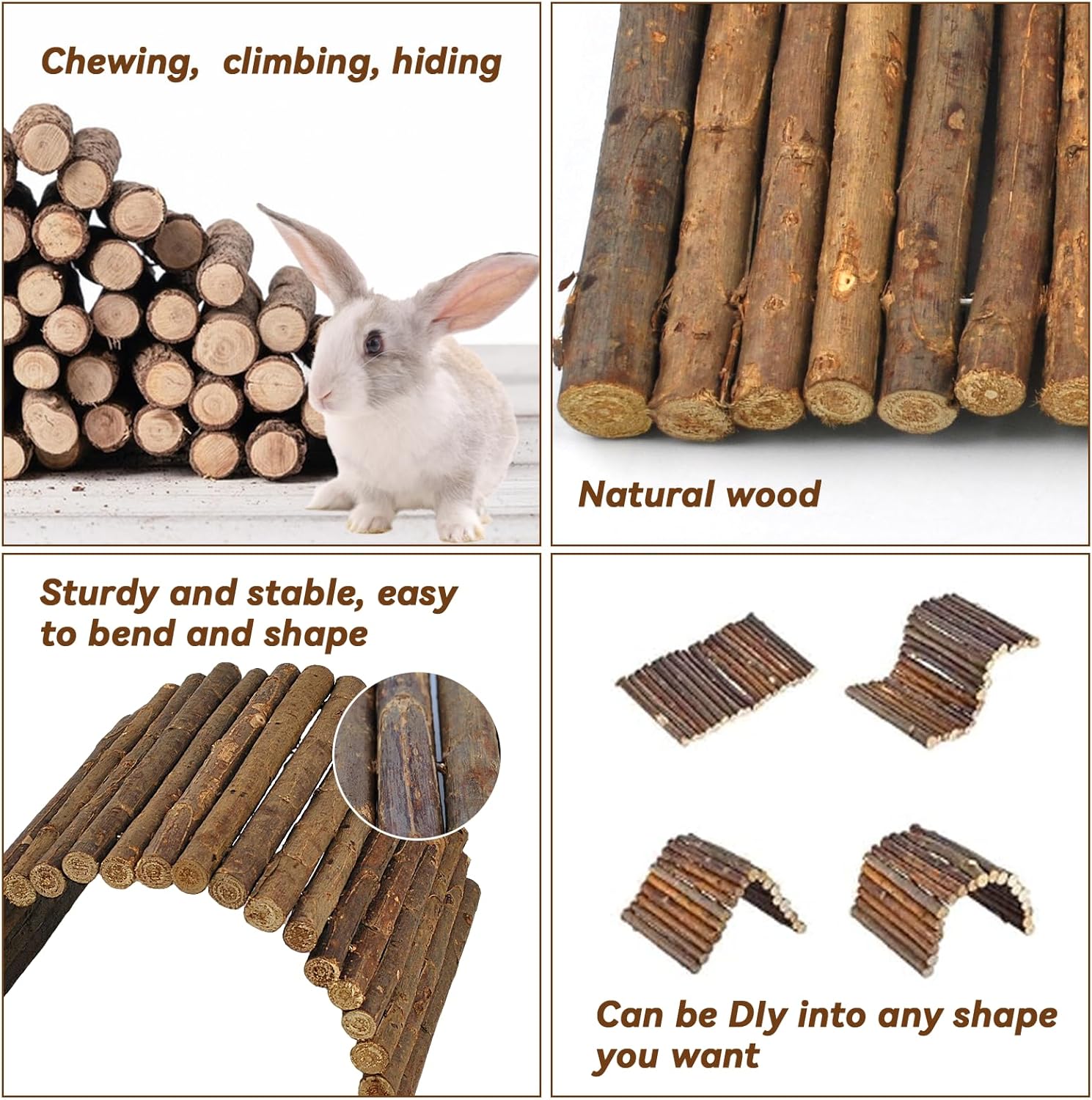 - 【Product Features】Wood guinea pig ladder internal metal wire can be freely bent,pliable and flexible,bunny wooden tunnels can be designed into tunnels,bridges or slopes and other shapes,adding more fun for pets. And flexible wood hideout made of solid wood is very sturdy, durable and practical.