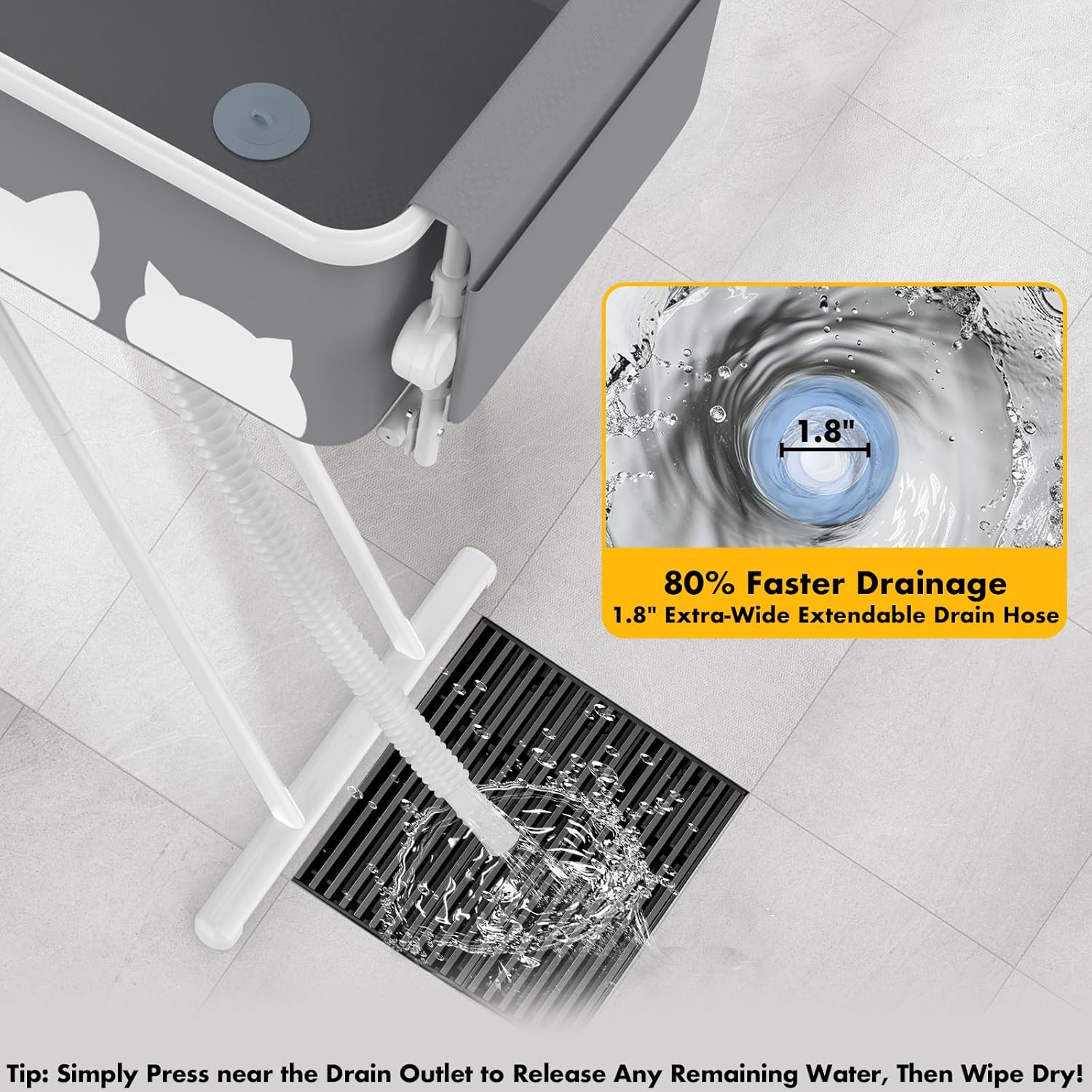 - Quick-Drain Design with Oversized Hose —Equipped with a 1.8-inch extra-wide & extendable drain hose for quick water flow—NO MORE LONG WAITS! Easily direct water into a floor drain, tub, shower, or bucket. More comfortable, efficient and faster—bathing your pet has never been easier!
