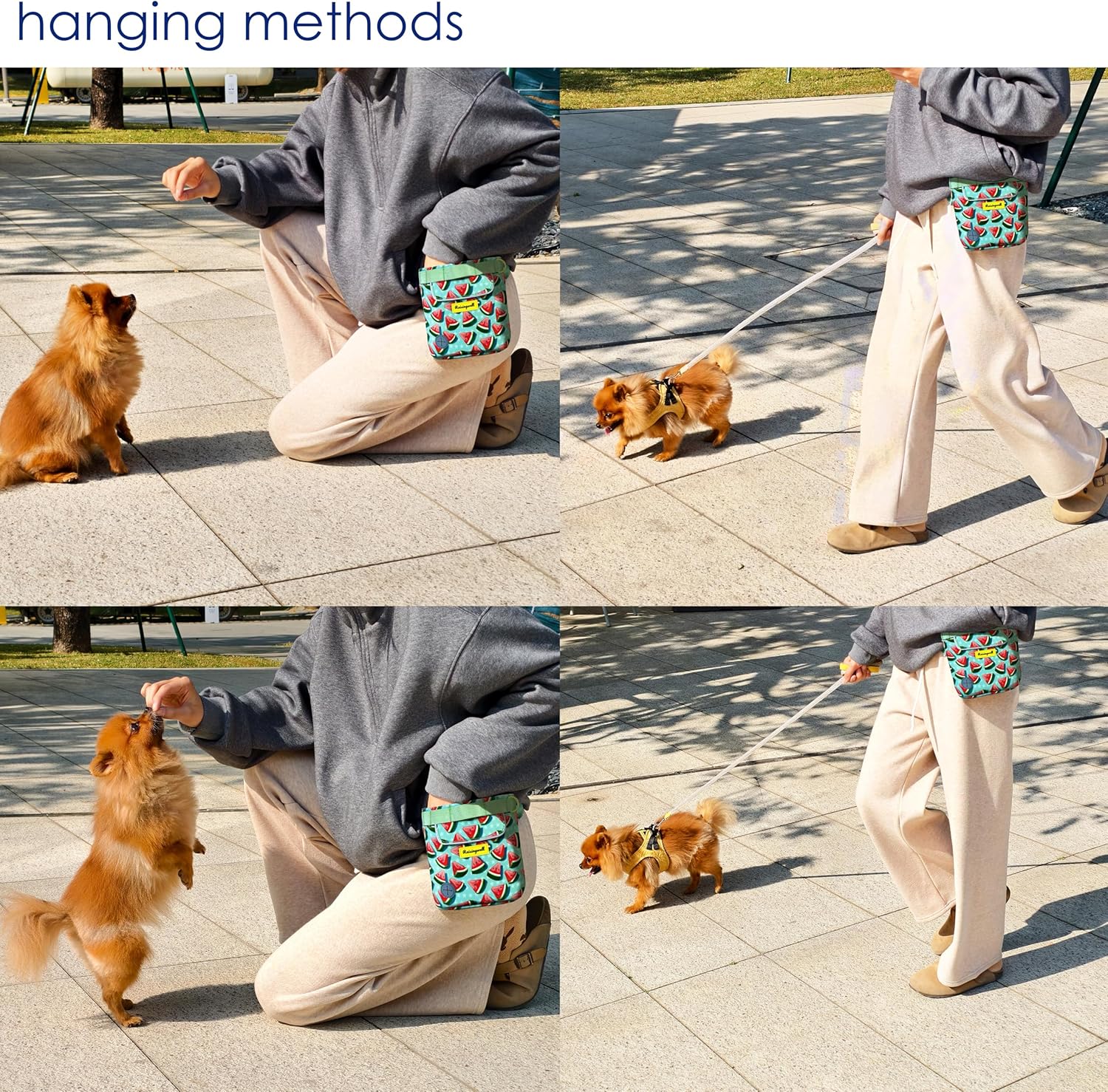- 3.Enhanced Magnetic Closure: The bag features two sets of powerful magnets at the opening, ensuring automatic closure and preventing food from spilling, even when bending over. A convenient pull tab allows for one-handed opening when you need access to the contents of your dog treat pouch. The strong magnets make it a perfect solution for training and walking, ensuring your treats stay secure in the dog treats holder for training.
