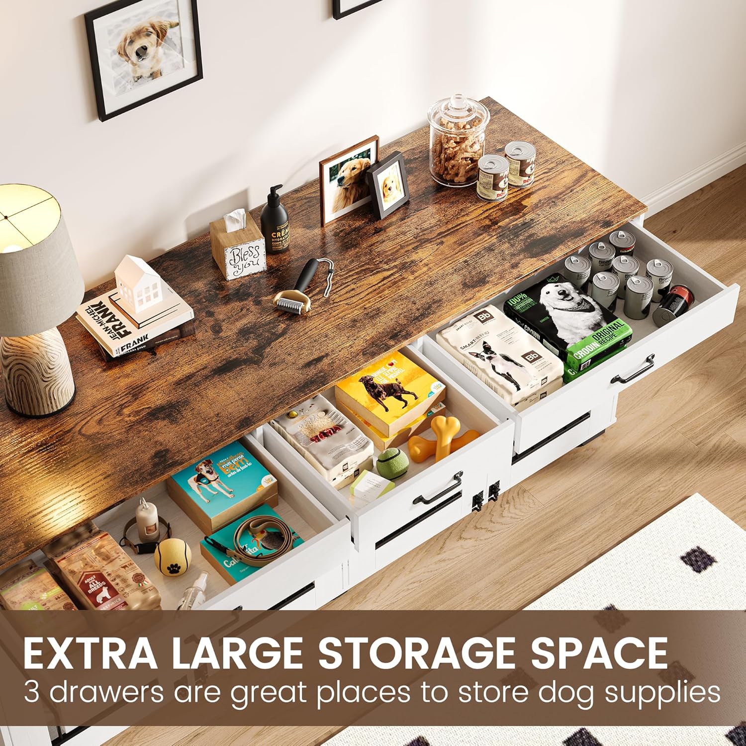 - Three-drawer smart storage: Three convenient drawers keep your home organized. Perfect for storing pet essentials such as pet toys, snacks and food, and even household items, helping you maintain a neat and organized space.