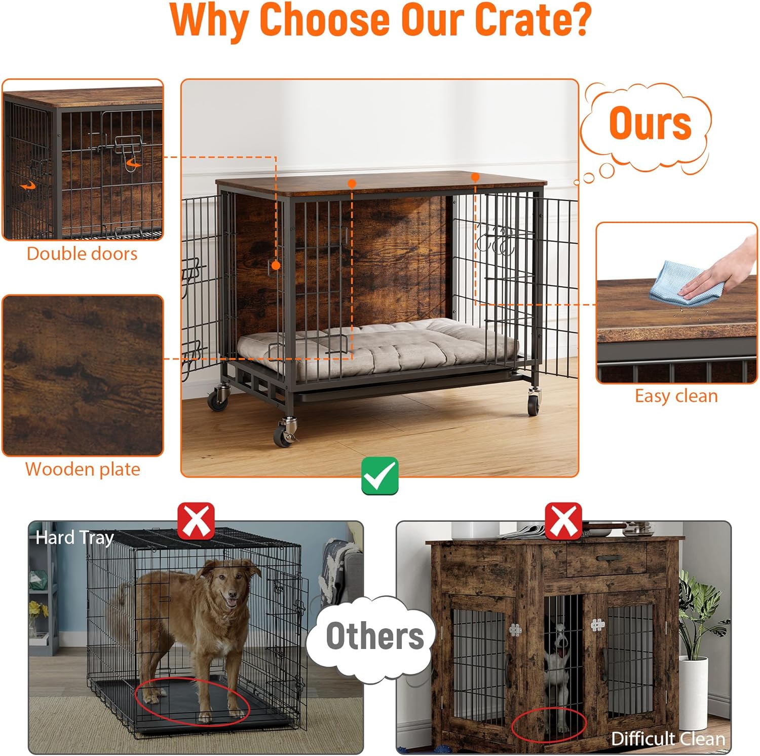 - 【Flexible Mobility and Stability Options】Choose between lockable 360-degree wheels for easy relocation and non-slip feet for steady installation. This flexibility allows you to optimize the setup of your dog kennel furniture, ensuring it is perfectly positioned in your living space and conveniently mobile as needed.
