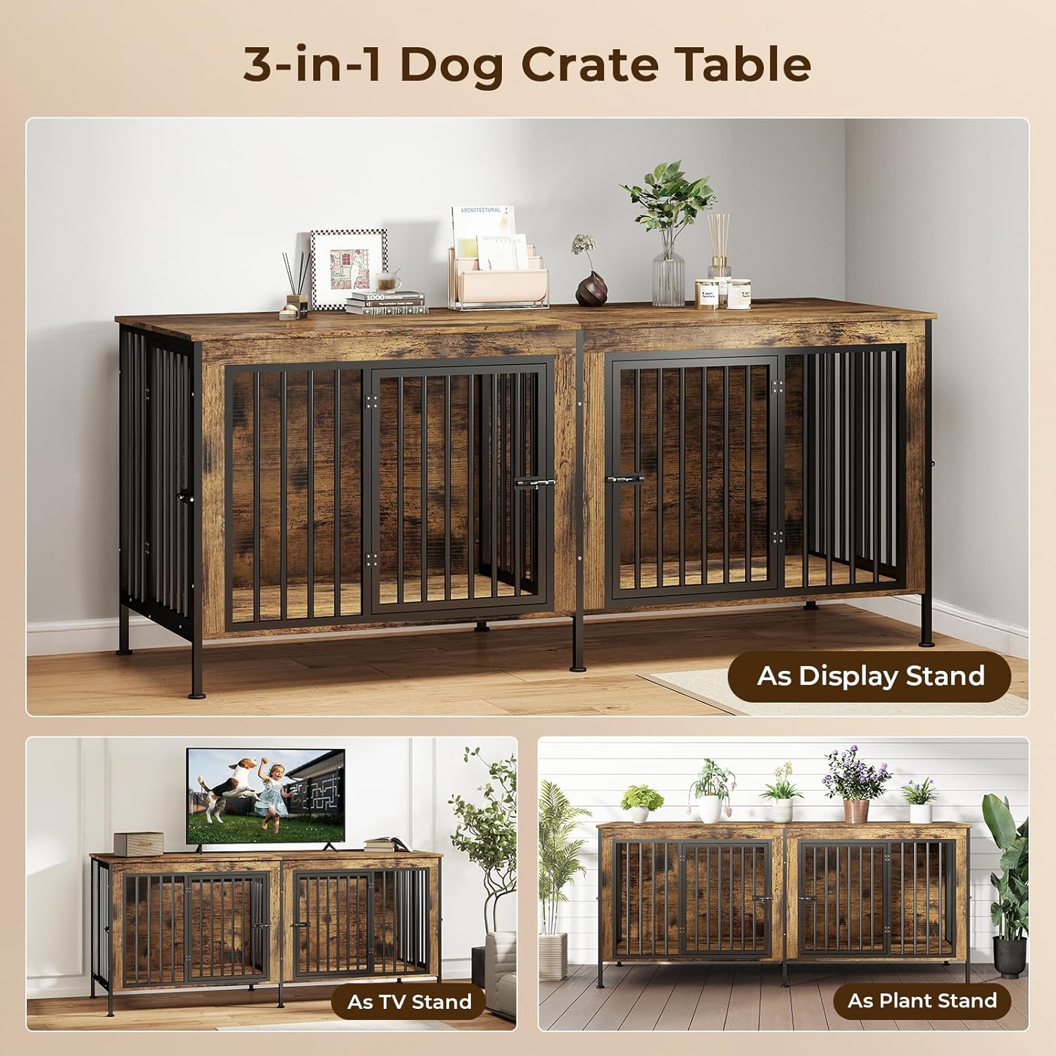 - Stylish & Multi-Functional:This indoor dog crate doubles as furniture with rustic wood grain and clean lines, fitting perfectly into your living room, bedroom, or entryway. It can serve as a TV stand, side table, or decorative piece while saving space.